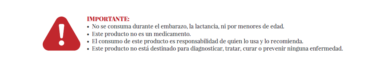 IMPORTANTE: Este producto no está destinado para diagnosticar, tratar, curar o prevenir ninguna enfermedad. El consumo de este producto es responsabilidad de quien lo usa y quien lo recomienda. Es recomendable consultar a tu médico antes de consumir cualquier producto adicional a tu dieta y alimentarte sanamente.