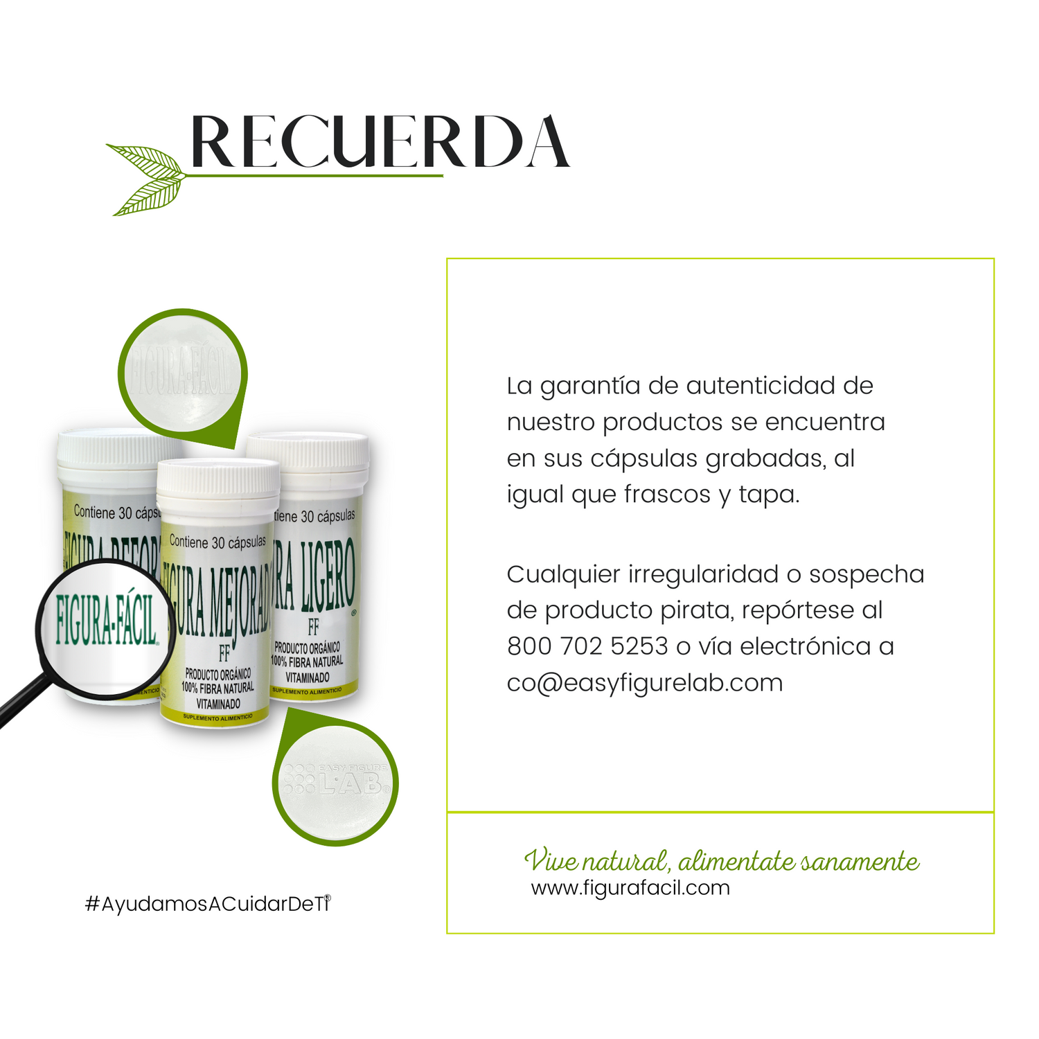 La garantía de autenticidad de nuestro producto se encuentra en sus cápsulas grabadas. Al igual que frasco y tapa. Cuidado con las imitaciones.